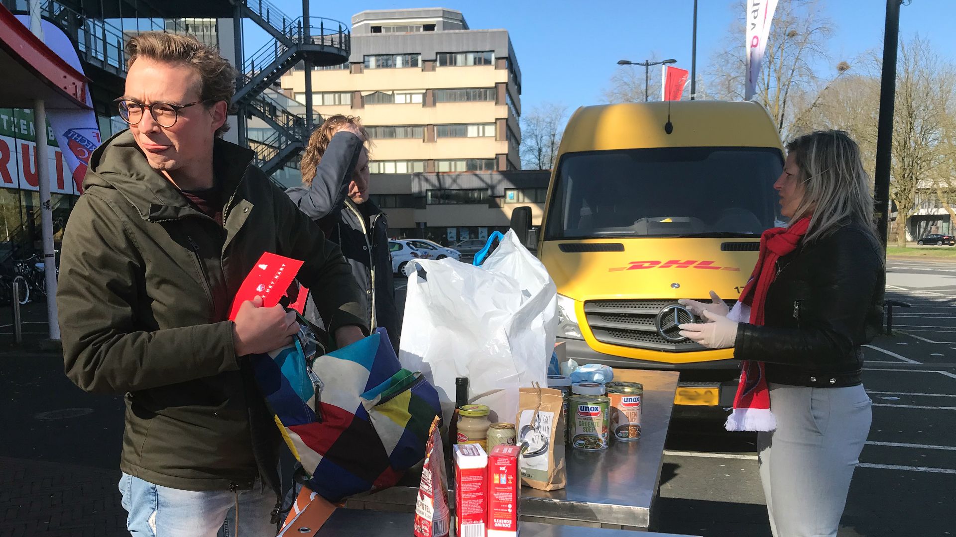 's Ochtends liep het al lekker door. "Zeker!", vertelt Marlou Peeters van FC Utrecht. "We hebben al heel veel boodschappenkarren naar binnen kunnen rijden. Binnen hebben we dozen staan die we gaan vullen." Ondertussen rijdt er een grote steekwagen binnen met een stapel dozen. "Tonijnstukjes voor in de salade met een lekkere dressing", vertelt de gulle gever. Even later komt er een auto langs met tientallen pakken koffie. Er komen ook mensen op de fiets of gewoon lopend met boodschappentassen vol pasta, sauzen en groenten in blik. "Alle kleine beetjes helpen."