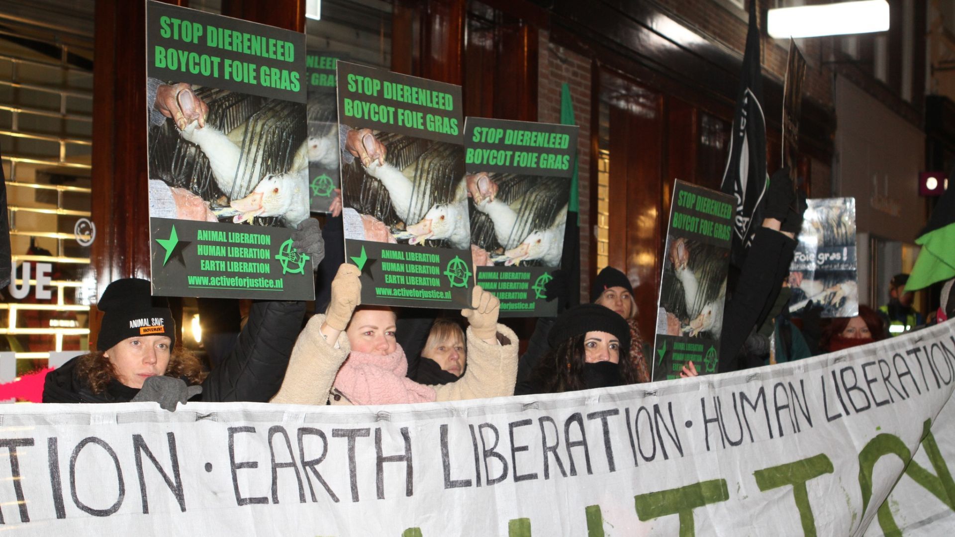Voor de tweede keer deze maand demonstreerde Active for Justice zaterdag in Utrecht. De actievoerders hekelen de manier waarop foie gras tot stand komt. Ganzen of eenden krijgen via een lange buis dwangvoeding toegediend, waardoor de lever groter en vetter wordt.